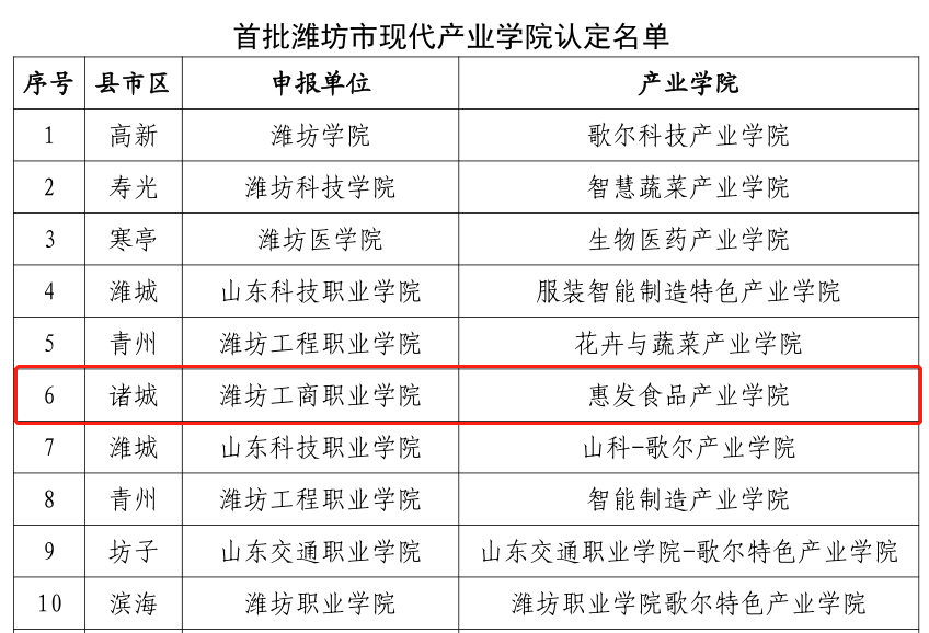 近日,潍坊市现代产业学院建设工作专班办公室公布了《首批潍坊市现代产业学院认定名单》,由我校与山东惠发食品股份有限公司共建的“惠发食品产业学院”入选首批潍坊市现代产业学院认定名单且综合排名靠前。