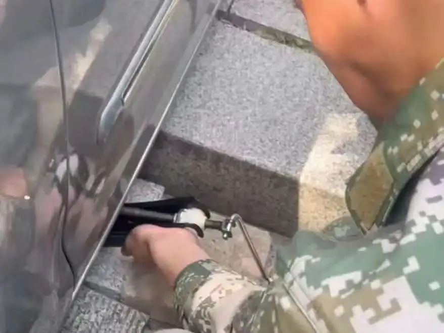 面对突发状况,国防班同学迅速反应。班长徐浩、潘怡元立即组织分工:两名有驾驶经验的同学操作千斤顶,其余成员分头寻找砖块、石块等垫高工具。众人围绕车辆展开救援,尝试人力抬车未果后。