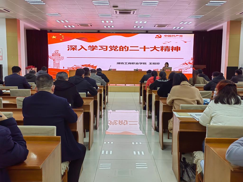 会议第二阶段由潍坊工商职业学院马克思主义学院院长王桂珍做了《深入学习党的二十大精神》的报告,王院长结合二十大主题,从过去五年的工作和新时代十年的伟大变革;开辟马克思主义中国化时代化新境界;新时代新征程中国共产党的使命任务;加快构建新发展格局,着力推动高质量发展;实施科教兴国战略,强化现代化建设人才支撑等方面带领大家一起学习了二十大精神