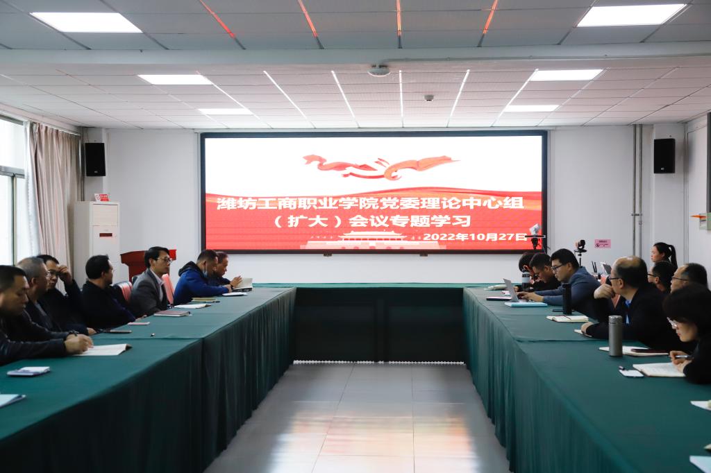 10月27日,潍坊工商职业学院召开党委理论学习中心组(扩大)会议专题学习党的二十大精神。学校领导班子全体成员、党委委员,有关部门负责人、二级学院院长、各党支部书记、优秀师生代表与会。党委书记葛国文主持会议并就深入学习领会党的二十大精神谈了体会。党委委员、办公室主任杨永,副校长郭素森先后领学了习近平总书记在中共中央政治局第一次集体学习时的讲话精神和二十大报告。