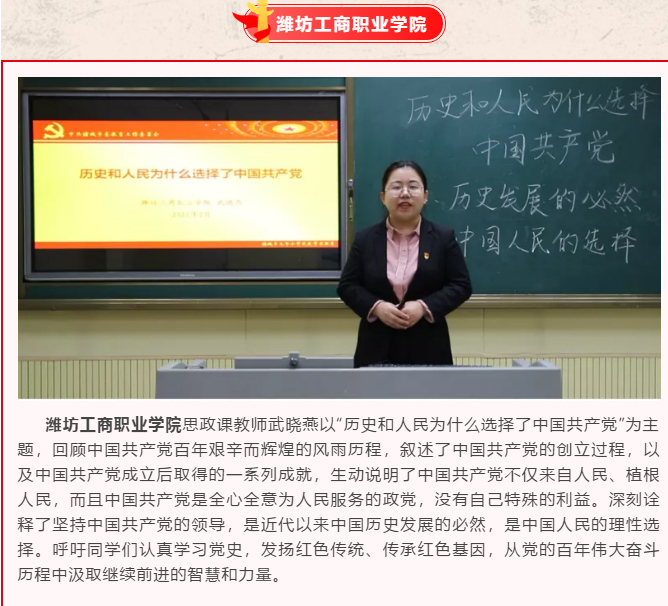 为庆祝中国共产党成立100周年,按照市教体局大中小学生同上一节课的统一部署, 3月1日,潍坊工商职业学院全校师生通过腾讯课堂平台以线上网课的形式进行了开学第一课学习中国共产党党史的活动。