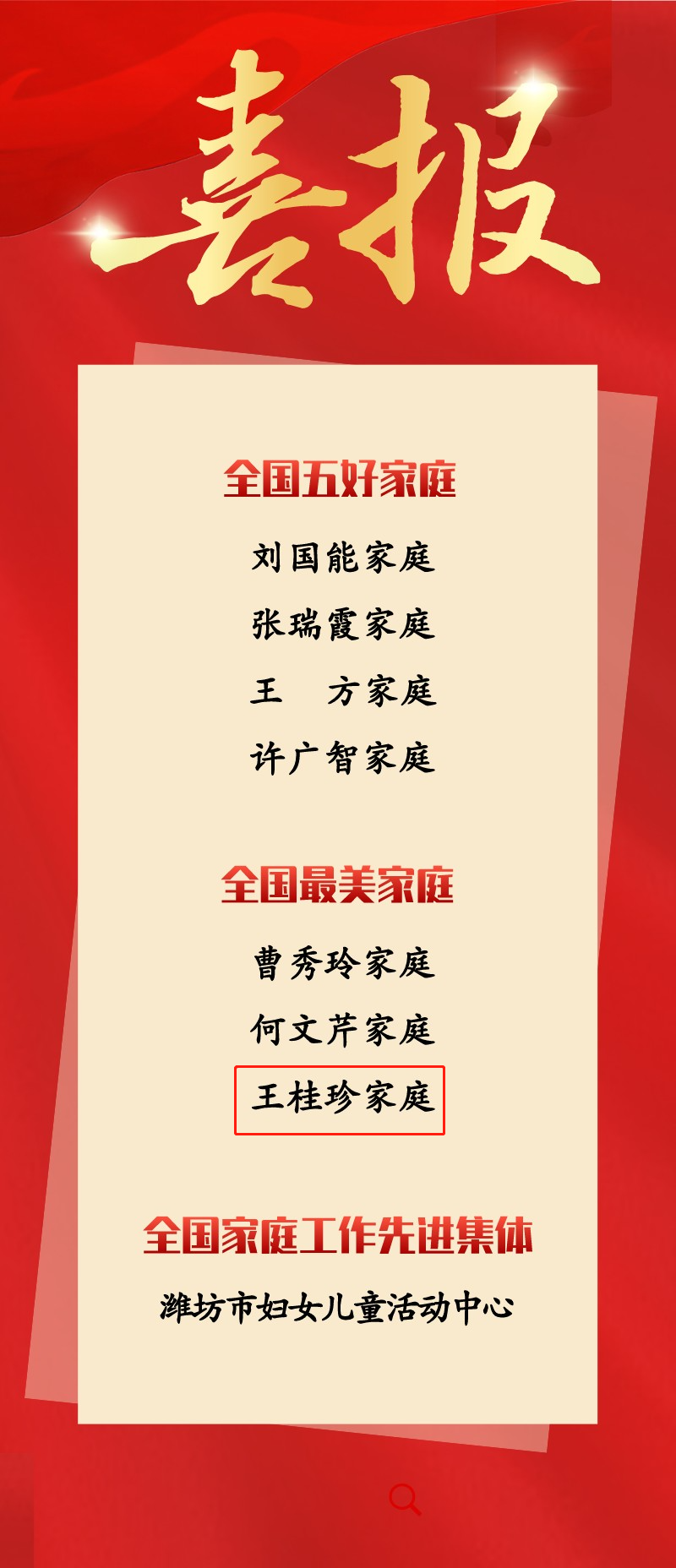 5月15日,在第29个国际家庭日,全国妇联表彰第十三届全国五好家庭暨家庭工作先进集体、先进个人,揭晓2022年全国最美家庭。其中,我市王桂珍家庭荣获全国最美家庭。